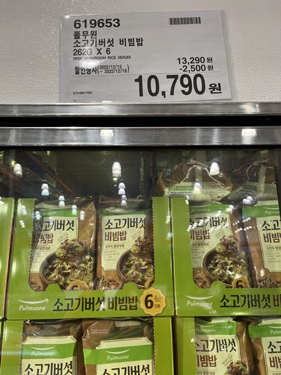 간단하게 한끼를 위해 냉동실에 하나씩 쟁여두잖아요 코스트코 쇼핑을 갈때마다 할인하는지 살펴보고있어요 코스트코에서 할인을 하면 당연히 구매해야하는거죠 풀무원 소고기버섯비빔밥은